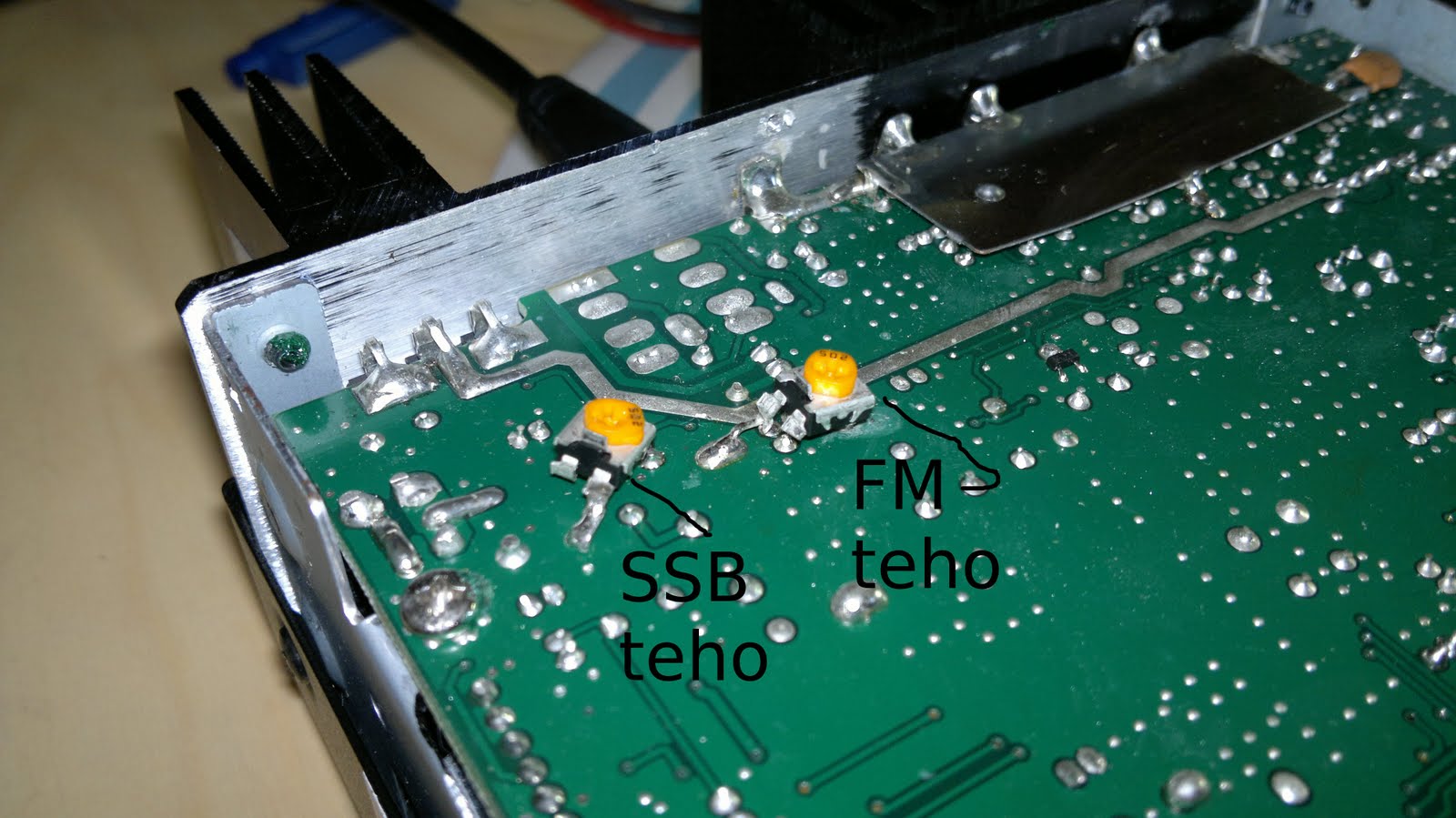 SSB-tehoa saa nostettua vielä korkeammalle (25W saakka) komponenttipuolelta kuvassa kynällä osoitetusta trimmeristä..