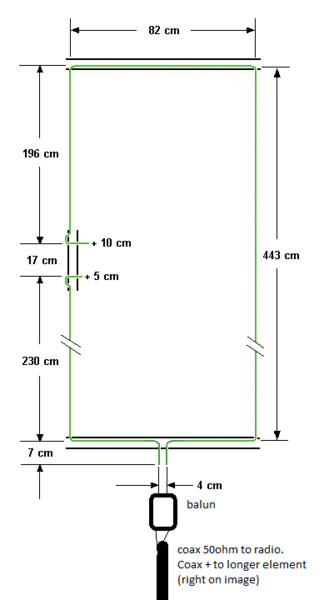 Baluniksi antennille joko 1:1 toroidibaluni tai koaksiaalibaluni joka kääritään 4,8cm halkaisijaltaan olevan muoviputken päälle, 60 kierrosta RG58 koaksiaalia. Antennin syöttö koaksiaalin keskikarva pitempään elementtiin, vaippa lyhempään.