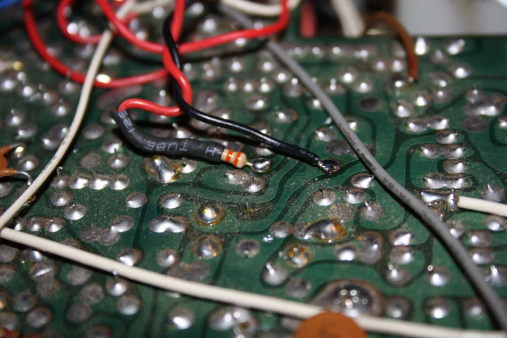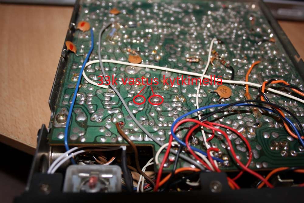 Tämän jälkeen juotin CB/PA kytikimelle parikaapelin jonka toisen pään juotin R42 vastuksen toiseen jalkaan ja toiseen päähän 33kOhm vastuken jonka toinen pää juotettiin R42 toiseen jalkaan. Näinollen "preampin" voi kytkeä päälle ja pois CB/PA-kytkimestä.