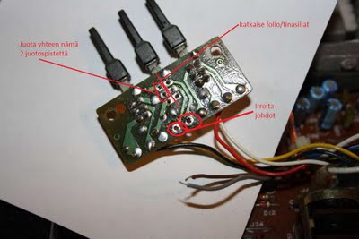 Seuraavana työvaiheena valmistellaan DX/LOC kytkin yläkanavien valintaan. Katkaise keskimmäiset tinasillat/foliot kuvan mukaisesti ja juota nastoista keskimmäinen ja etulevyn puoleinen yhteen. Varo lämmittämästä jalkoja liikaa jos käytössäsi on tehokas juotin, muovisisustainen liitin ottaa itseensä suhteellisen helposti.. Kun nämä työvaiheet on suoritettu, tarkista yleismittarilla poistamasi tinasillat ettei ne jää yhteen. OK?