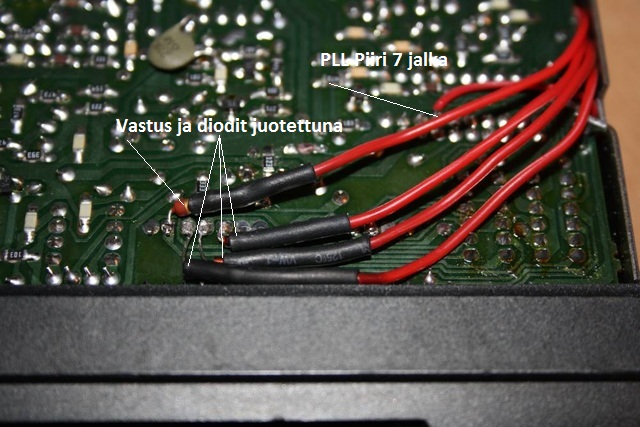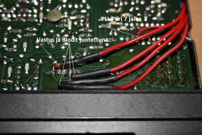 Tämän jälkeen juotetaan R129 ja 130 vastuksilta tulevat diodit ja PLL-piirin 7 jalkaan menevä johto NPN transistorin emitterin. Samaan pisteeseen juotetaan myös DX/LOC-kytkimelle menevä johto. R131 vastukseen juotetulle diodille menevä johto juotetaan transistorin kollektoriin ja R132 vastukselle menevän 39K vastusksen johto transistorin kantaan.