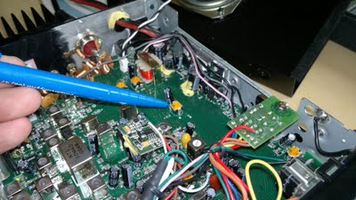 SSB-tehoa saa nostettua vielä korkeammalle (25W saakka) komponenttipuolelta kuvassa kynällä osoitetusta trimmeristä..