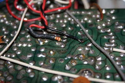 Tämän jälkeen juotin CB/PA kytikimelle parikaapelin jonka toisen pään juotin R42 vastuksen toiseen jalkaan ja toiseen päähän 33kOhm vastuken jonka toinen pää juotettiin R42 toiseen jalkaan. Näinollen "preampin" voi kytkeä päälle ja pois CB/PA-kytkimestä.