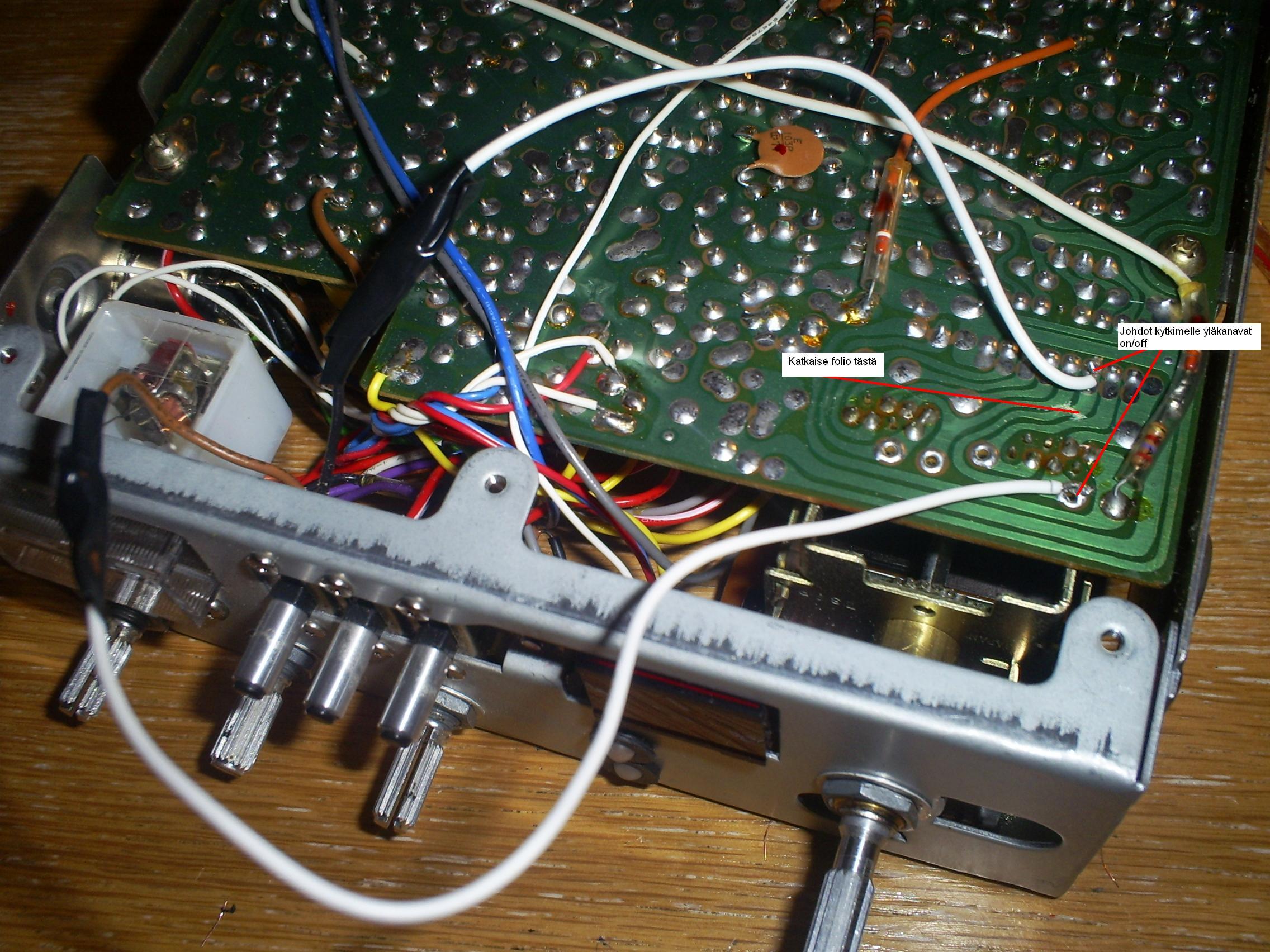 Modifiointi oli toteutukseltaan hyvin yksinkertainen. Radion yläkansi auki ja oikeassa alanurkassa (koneen naamataulu sinuunpäin katsottuna) on PLL-piirin nastat. Yläkanavat saa käyttöön katkaisemalla nastalle 11 menevän folion.