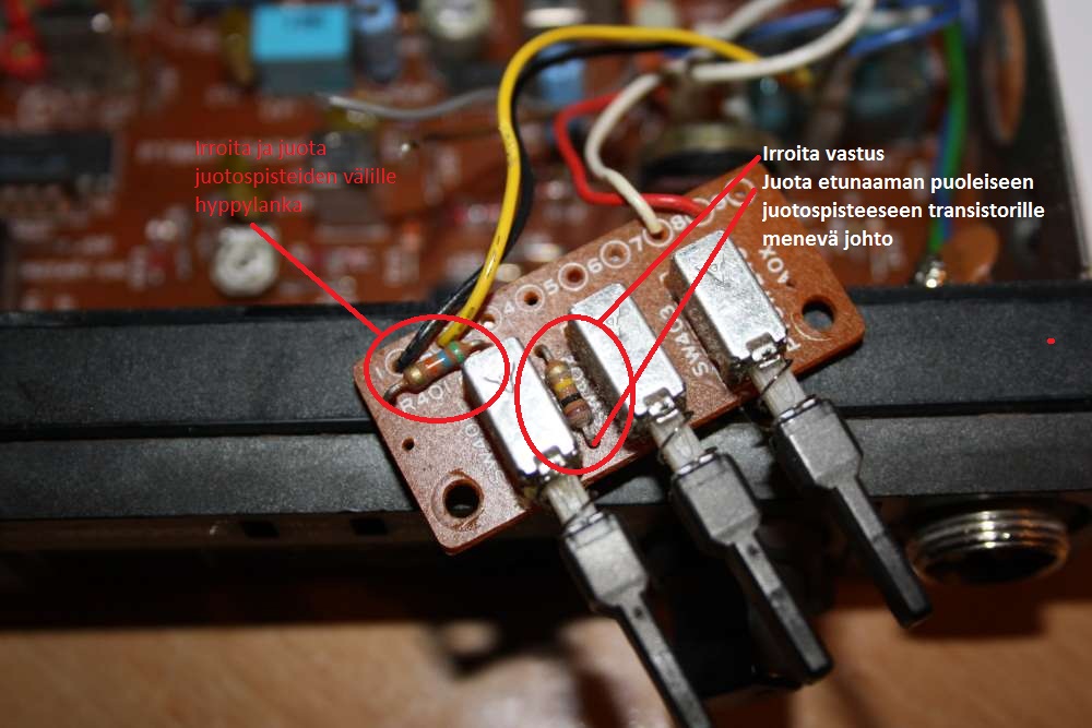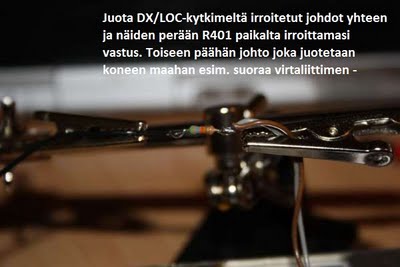 Tämän jälkeen juotetaan R129 ja 130 vastuksilta tulevat diodit ja PLL-piirin 7 jalkaan menevä johto NPN transistorin emitterin. Samaan pisteeseen juotetaan myös DX/LOC-kytkimelle menevä johto. R131 vastukseen juotetulle diodille menevä johto juotetaan transistorin kollektoriin ja R132 vastukselle menevän 39K vastusksen johto transistorin kantaan.